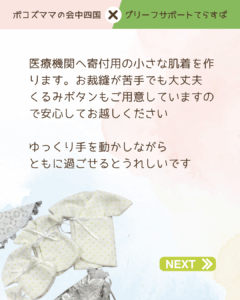 当日は、医療機関へ寄付用の小さな赤ちゃんのための肌着を作ります